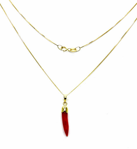 • PEGASO GIOIELLI Collana Donna Oro Giallo 18kt (750) Catenina Veneta, Pendente Corno Cornetto Corallo Rosso